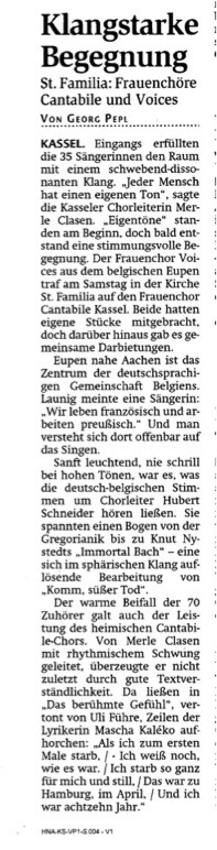 Vom 6. bis zum 8. März begab sich der Eupener Frauenchor Voices, mit finanzieller Unterstützung der DG, auf Chorreise in die nordhessische Stadt Kassel. Gastgebender Chor war der Frauenchor Cantabile Kassel, unter der Leitung von Dr. Merle Clasen, der seit 1989 existiert und als Projektchor mehrmals im Jahr gezielt auf ein bis zwei Konzerte hinarbeitet.